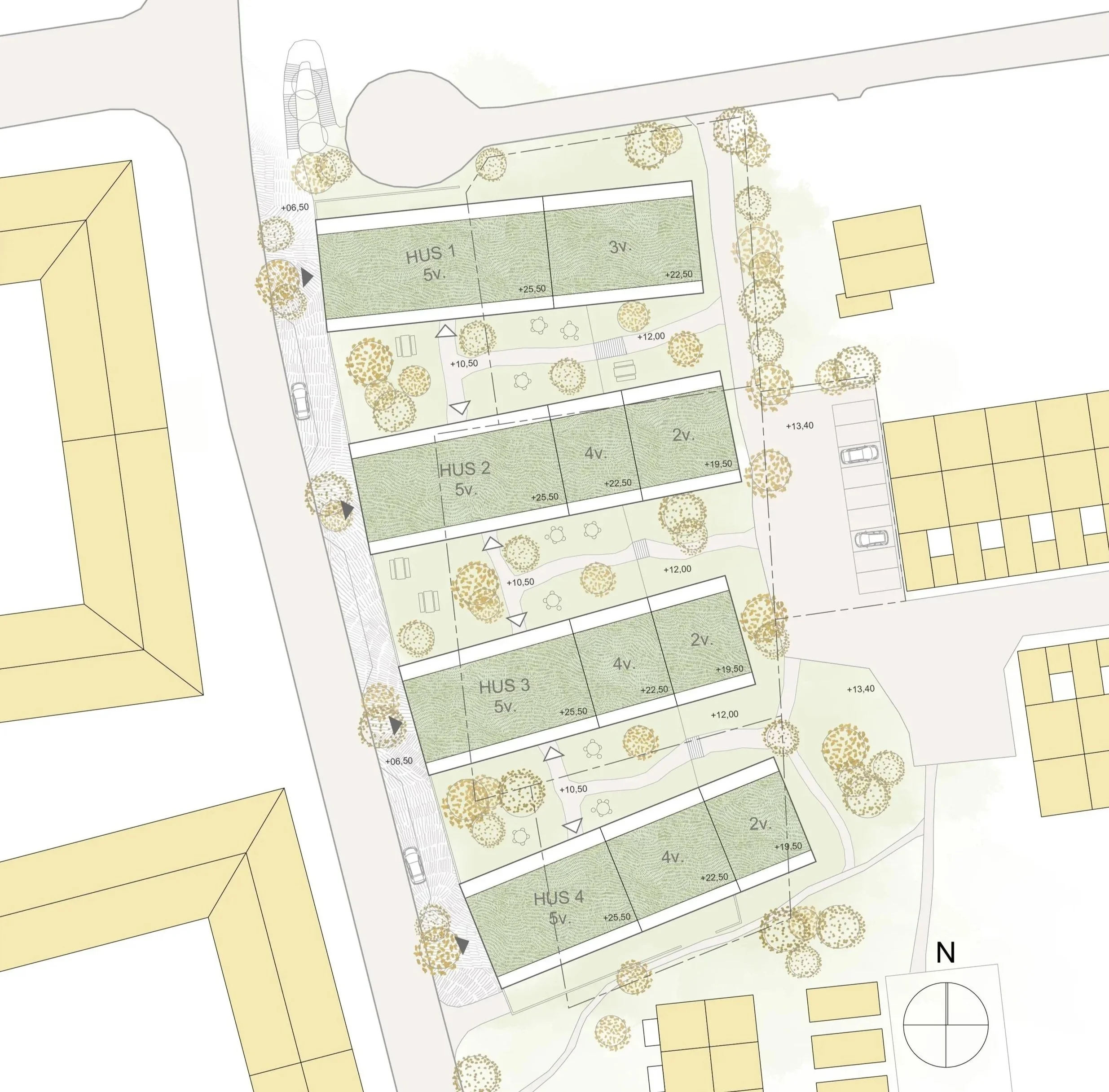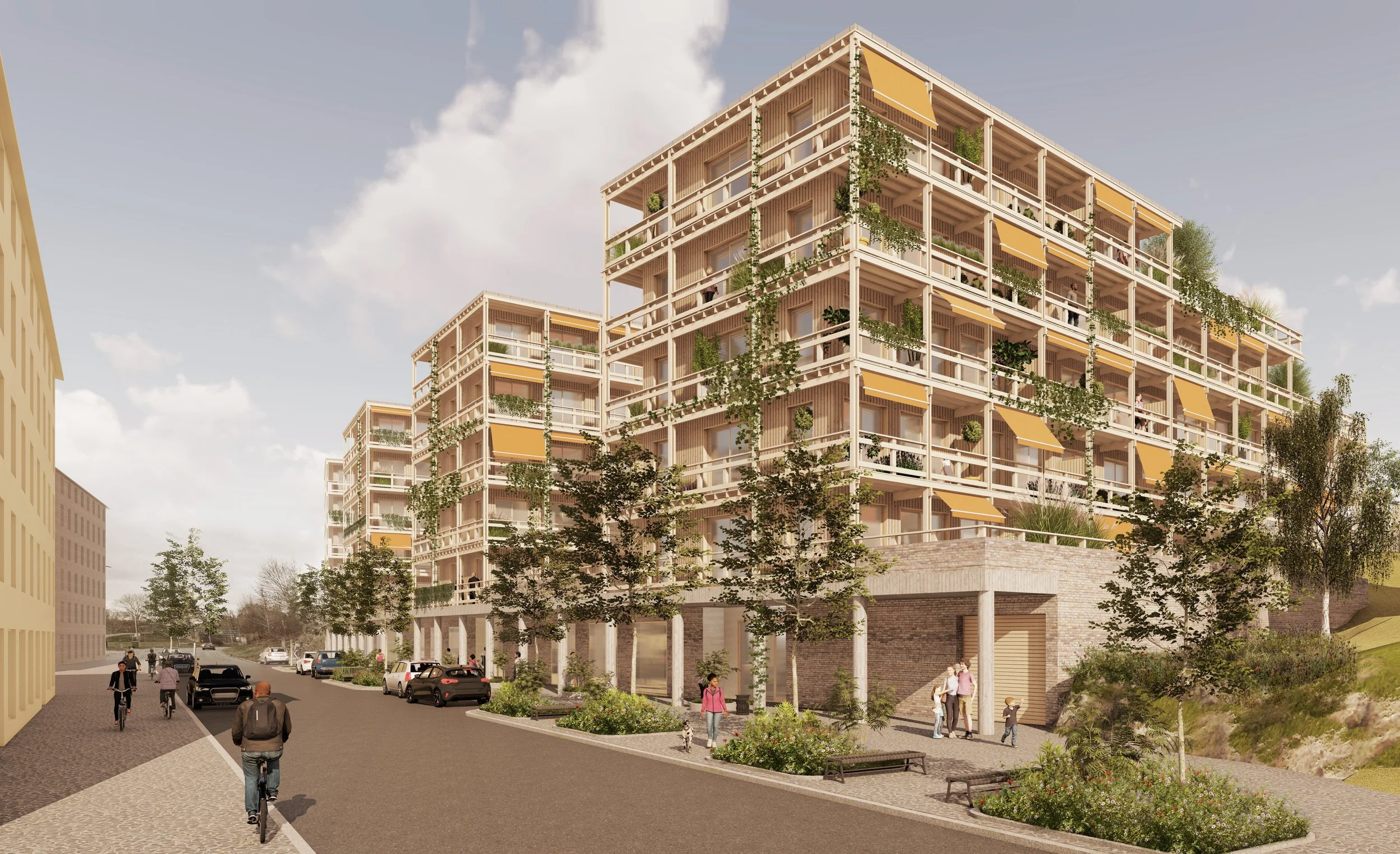 I förslaget har naturen en stor roll för den nya bebyggelsen som har en öppen struktur och låter omgivningen likt tårtbitar ta sig in mot de gröna innergårdaran och de gröna takterraserna som blir en viktig del av boendemiljön men även för våra grannar. Stigar knyter ihop bostäderna med naturen och bebyggelsen formar medvetet platser för möten.